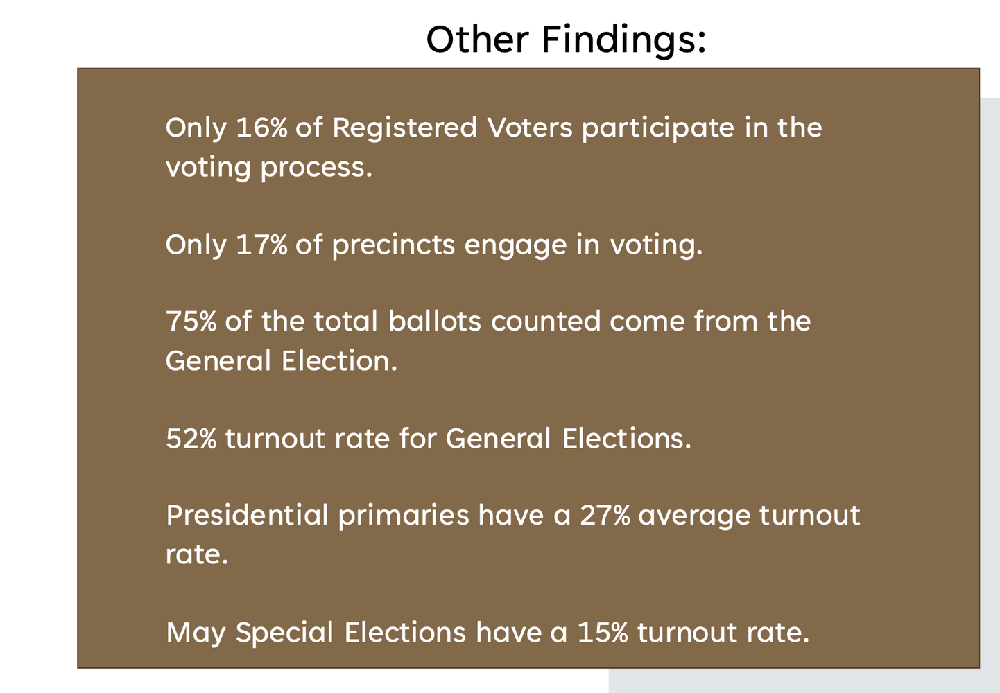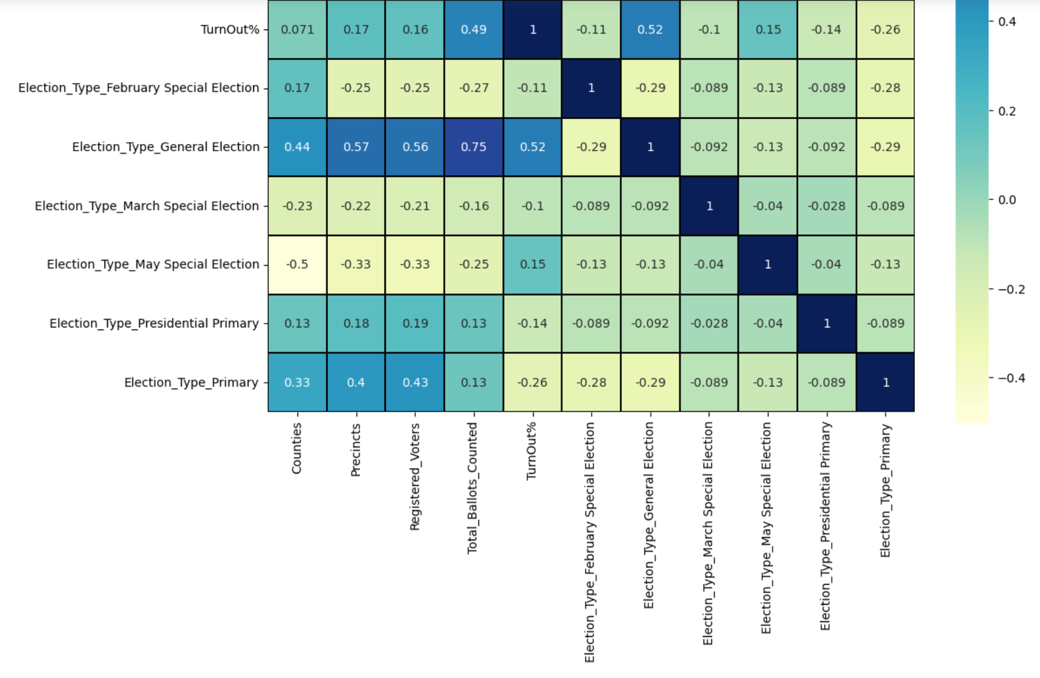 The original columns used are: ‘Date’, ‘Election_Type’, ‘Counties’, ‘Precincts’, ‘Registered_Voters’, ‘Total_Ballots_Counted’, ‘TurnOut%’.