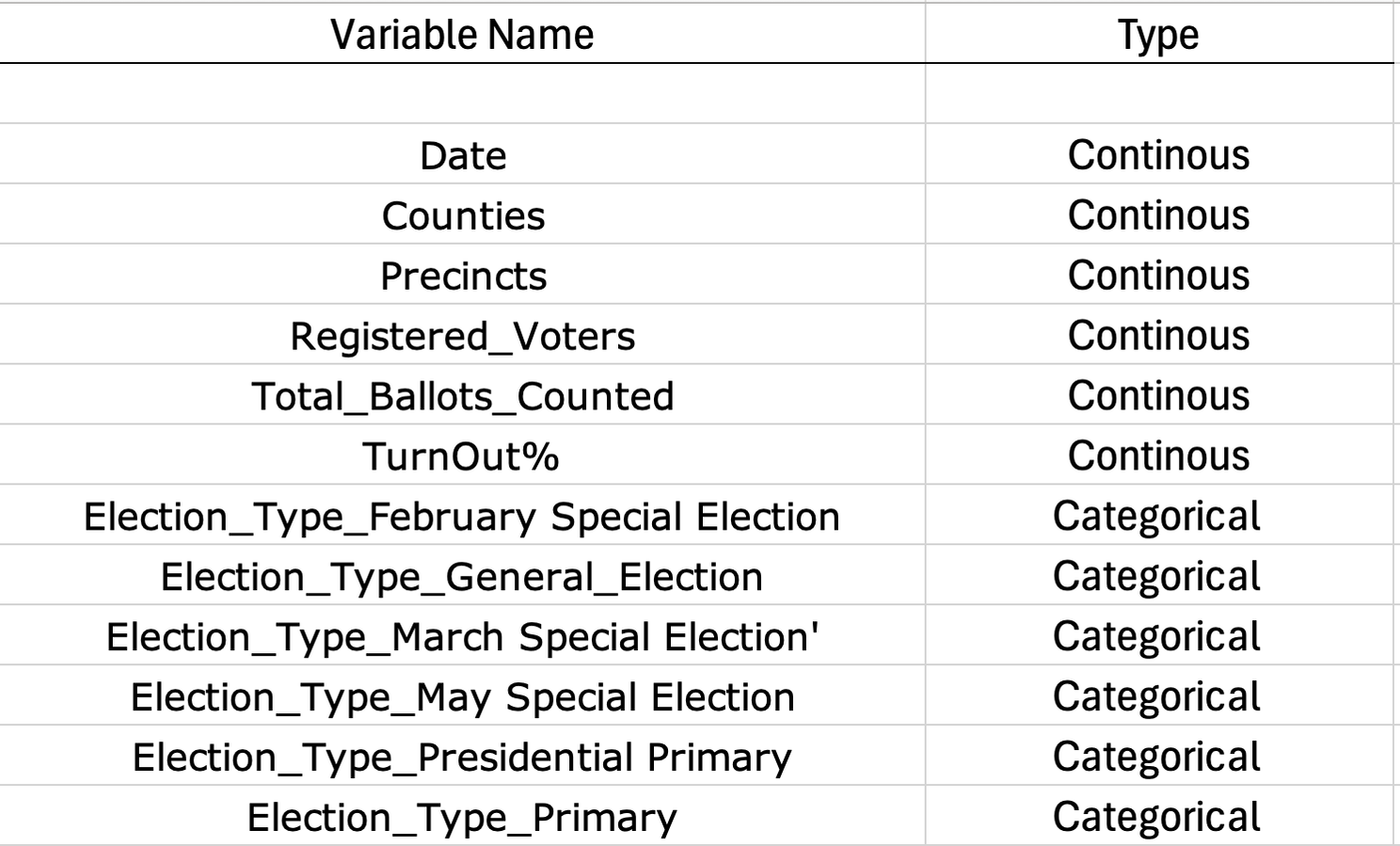 The columns generated after cleaning are: ‘Date’, ‘Counties’, ‘Precincts’, ‘Registered_Voters’, ‘Total_Ballots_Counted’, ‘TurnOut%’, ‘Election_Type_February Special Election’, ‘Election_Type_General Election’, ‘Election_Type_March Special Election’, ‘Election_Type_May Special Election’, ‘Election_Type_Presidential Primary’, ‘Election_Type_Primary’.