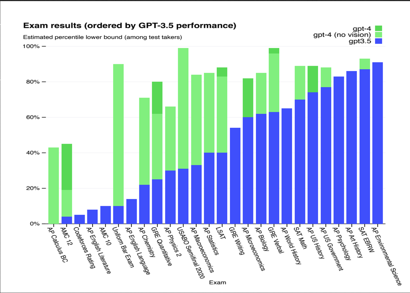 The below graph is source from the Chat GTP-4 scientific methodology paper showcasing the model scores and differences between the GTP 3.5 in blue and 4 in green. The graph shows the different academic categories and how they scored. While Chat GTP is impressive, it’s important to understand its limitations and accuracy.