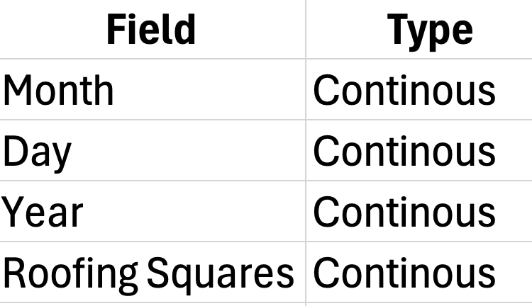 Planed and directed data gathering in coordination with the City of Spokane. Meticulously searching for individual roofing permits containing the variables: “Address”, “Date”, “roof size”. Then transferring that raw data to a csv file. Sourced from the city means that it may be limiting in accuracy and completeness. In forecast modeling, the dependent variable must be a continuous (interval or ratio) level of measurement (Statology, 2019). Fortunately, all dependent variables are continuous. The dataset is 50% sparse for the Roofing_Squares column only.