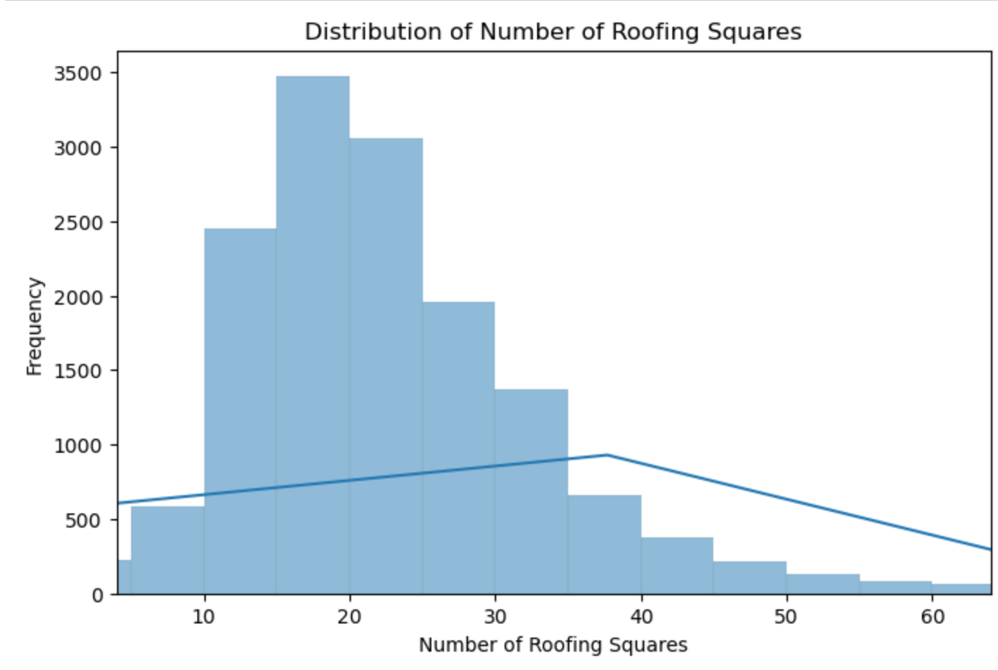 Fun Fact: The average roof requires 23 squares to cover it. Notice the graph with showcasing the frequency distribution of roofing square quantities needed against the count of roofing permits.