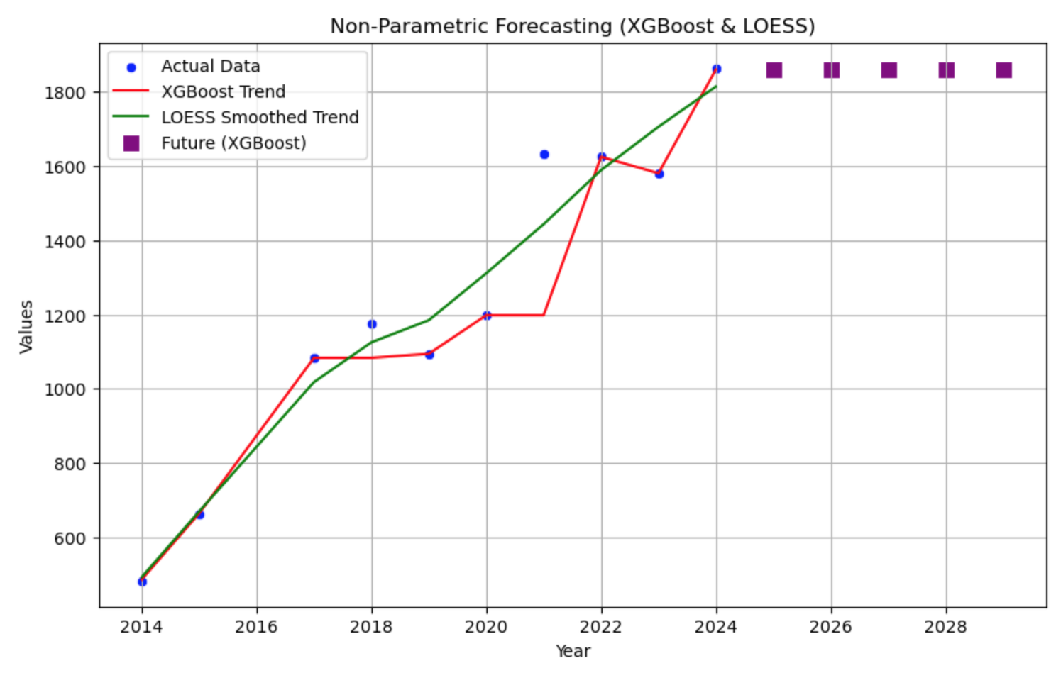 The next graph is a statistical prediction, using linear regression, to forecast the next five years of roofing permits being submitted; Based on the years of 2014 – 2024. After various optimization attempts with Random Forrest, its Gradient Boost variant, and incorporating a LOESS smoothing curve, no accurate predictions could be made.