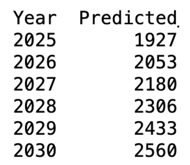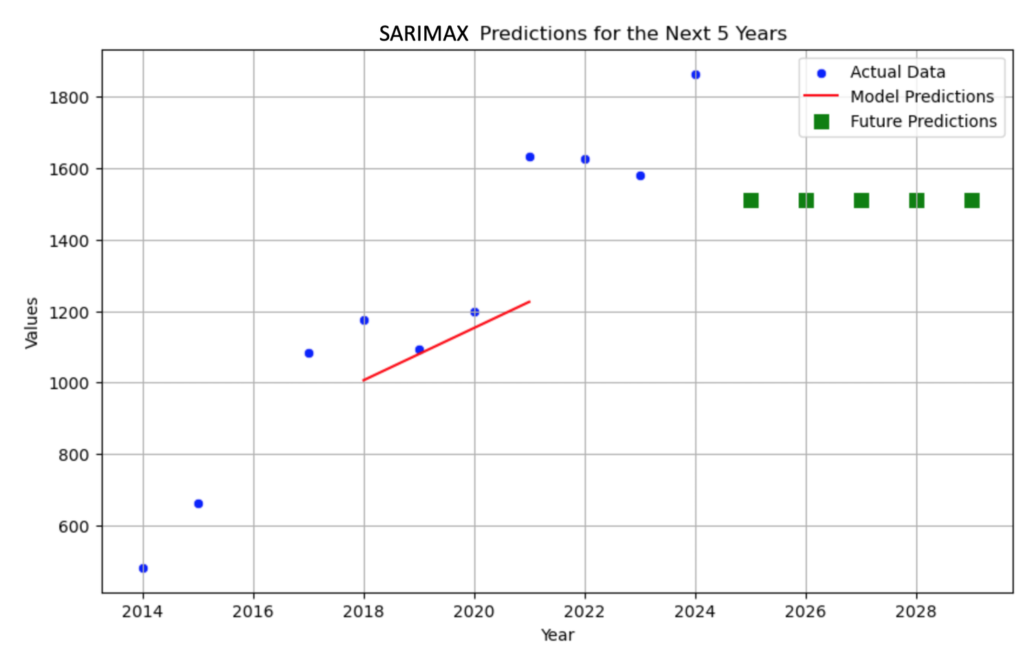The above Random Forrest prediction showcases the how the model is not able to generate a prediction, giving the next five years the same answer. This is the case because the distribution appears to be too random. Next attempting to use a SARIMAX model after invoking stationarity via the order of first differencing and reconfirming with the ADFuller test; The SARIMAX model yielded the same result as before, failing to pick up on the pattern and predicting the same prediction for the next five years.