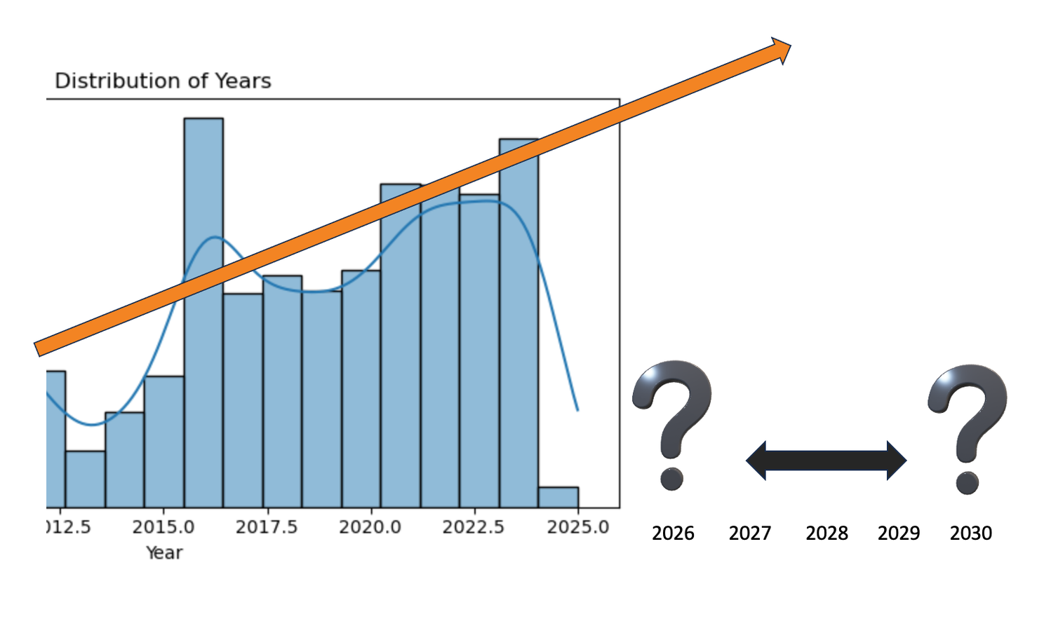 However, what if we just draw a straight line and go for basic algebra of y = mx+b. While that is not statistically sound nor does the distribution fit the assumptions of Linear Regression, it is a hasty way to forecast a trend based on a human identified pattern.