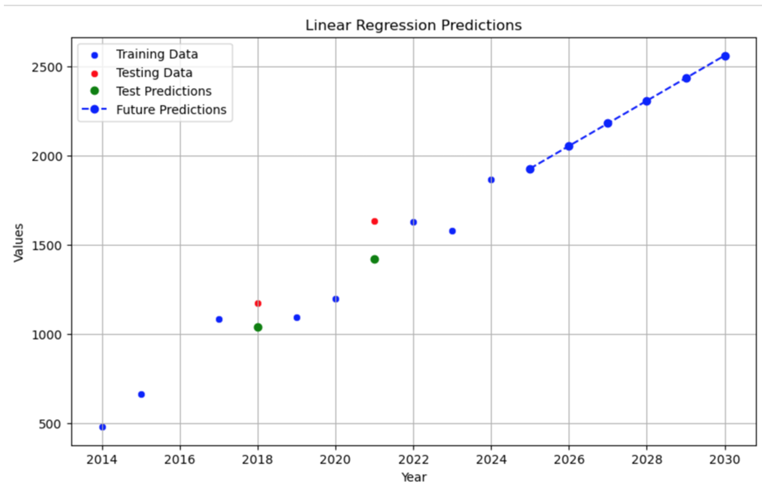 Below is a graph of the output for the Linear Regression model in python. Notice how Year is on the ‘x’ axis and number of permits are on the ‘y’ axis. The blue line connecting the blue dots in the upper right corner are the predicted line of best fit.