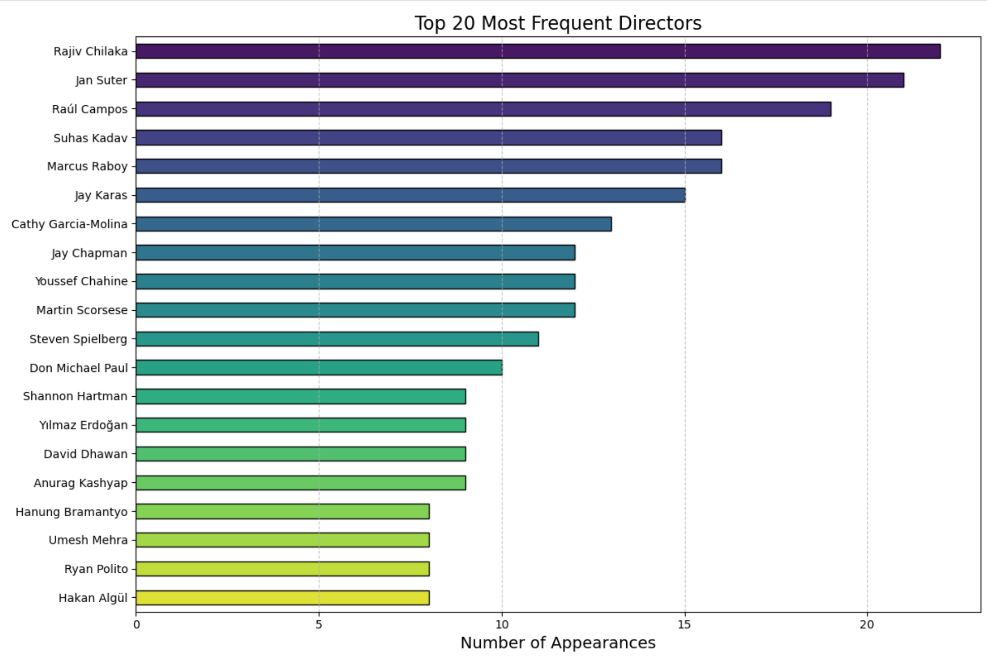 The below graph of directors shows that Rajiv Chilaka is the most frequent Netflix director.