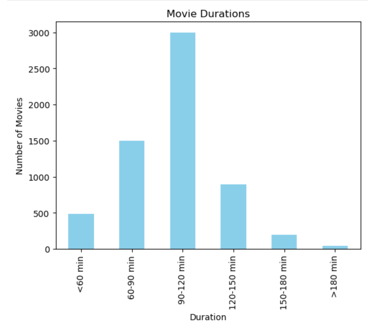 The below graph showcases the frequency of the movie durations. It suggests that films that are 90-120 minutes in length are the average on Netflix.