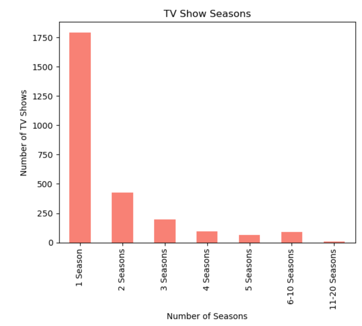 Notice that 1 season is the highest frequency. A 71% decrease in show quantity; Suggesting a 71% chance that a Netflix TV Show will not make it to season 2.