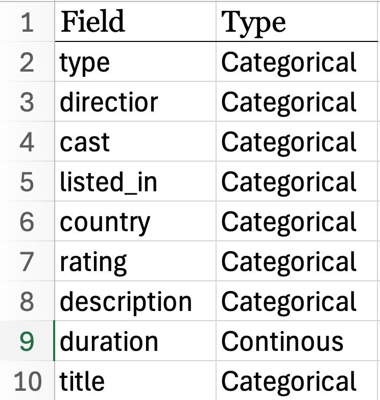 An opensource dataset of Netflix data containing the necessary variables about videos watched in a particular time period. A Kaggle dataset from www.kaggle.com. Kaggle is the opensource repository / organization that hosts the datasets. The dataset contains almost 8,807 rows (before any rows where removed) and 11 columns. The dataset is limited to only to the years of 2001-2023 videos watched on Netflix; The dataset has multiple columns for possible exploration. Different audiences watch shows at different time-zones all over the planet. Delimitations for this analysis, only 9 columns of interest will be used: The ‘type’, ‘director’, ‘cast, ‘listed_in’, ‘county’, ‘rating’, ’description’,’ duration’, and ‘title’; Therefore of the 11 columns only 9 are relevant for non-trivial insights.