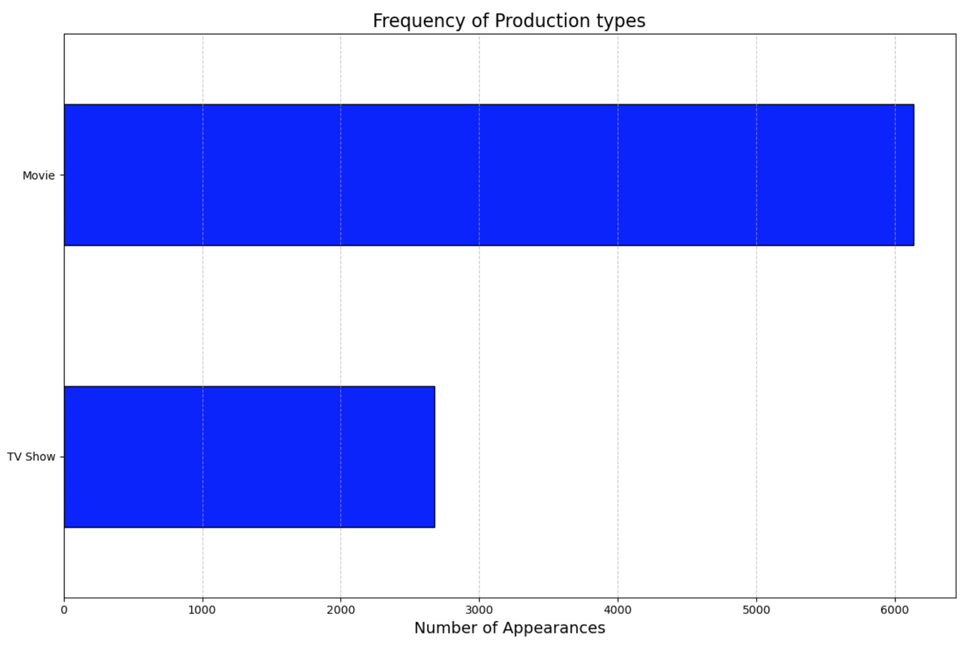 However, the frequency of ‘Movies’ vs. ‘TV Shows’ tells an inverse story. The dataset consisted of ‘0’ duplicate values, yet Movies are a higher frequency of watch vs. TV Shows; Which is contrary to the previous graph.