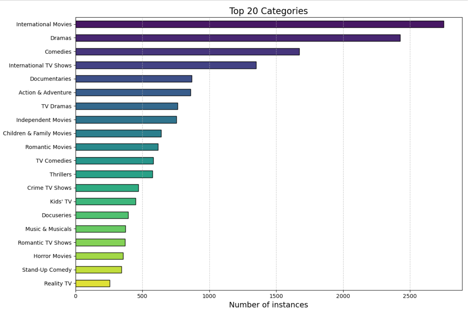 The following graph shows the the Top 20 film categories and their frequency on the ‘x’ axis. Notice that “International Movies’ are ranked number 1 and ‘International TV Shows’ are ranked number 4.